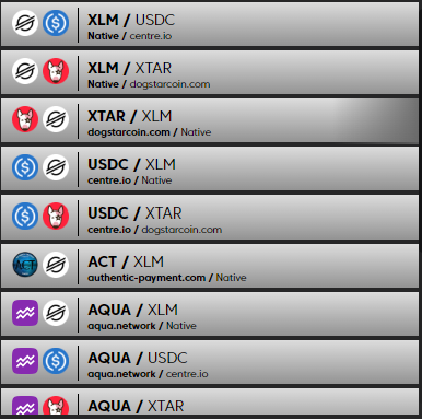El resto de mercados son indirectos. Esto es, si quieres adquirir un token que no tenga un mercado directo, necesitas pasar por un mercado común a ambos tokens (el que tienes y el que quieres comprar). Por ejemplo, si tienes AQUA y quieres adquirir SCOP, tienes que pasar por el mercado común XLM. De manera que se realizarán dos movimientos: AQUA a XLM; XLM a SCOP.