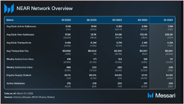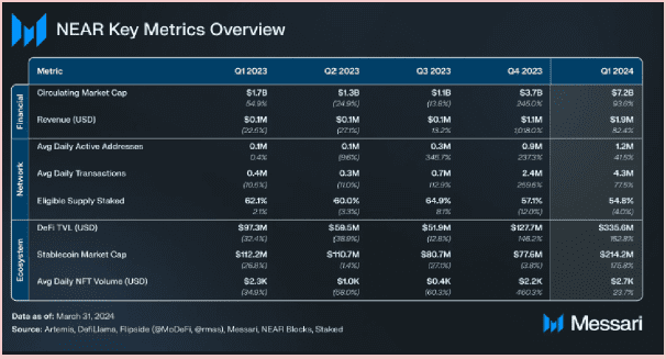 A continuación, las principales métricas de uso de NEAR Protocol hasta el primer trimestre de 2024. El trabajo realizado por las diferentes partes tiene como objetivo asegurar que, en última instancia, cada transacción sea rápida, segura y transparente.